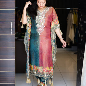 This elegant three-piece suit set includes a top, matching pant, and dupatta,